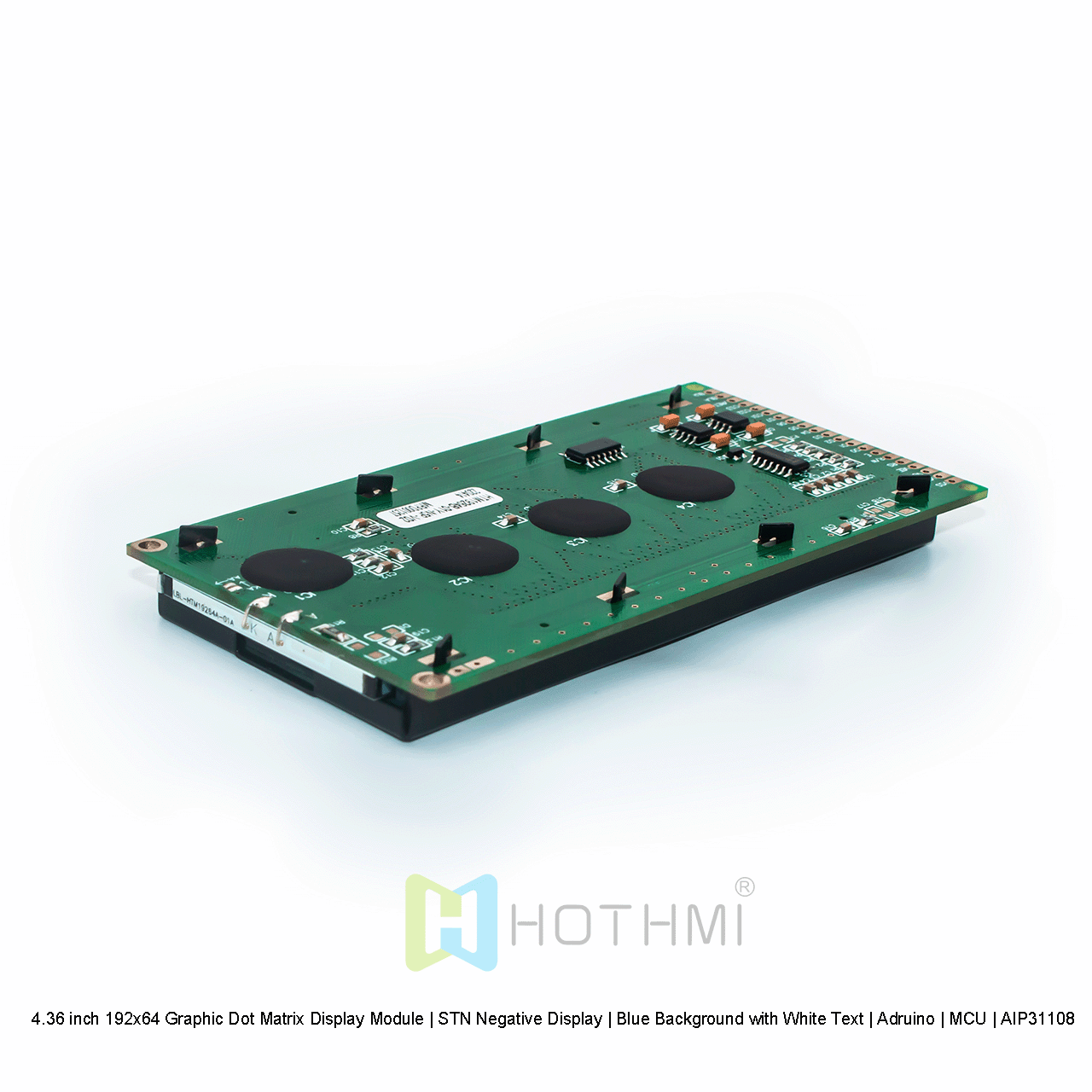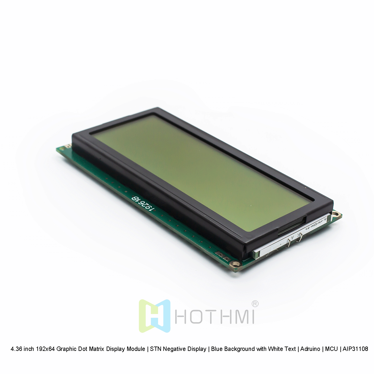 The 4.36 inch 192x64 Graphic Dot Matrix Display Module displays white pixels on a blue background. This fully transparent LCD display is carefully designed, and the LCD has a strong built-in backlight to provide high contrast and display clear graphics to the viewer. This advanced display technology ensures that the display is always easy to read regardless of the lighting conditions.