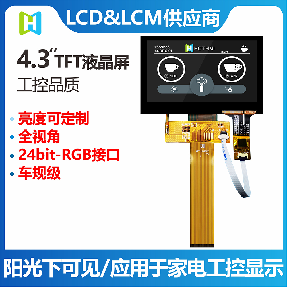 4.3 inch TFT color screen / 480*272 resolution / full viewing angle IPS process / RGB 24Bit / IIC interface / TFT-H043A21WQIST8C40 / used in coffee machines, home appliances, industrial control, medical display equipment, visible in sunlight