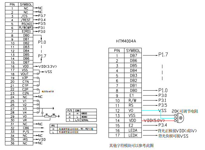 IRS:此腳為選擇用內(nèi)部調(diào)節(jié)還是外部調(diào)節(jié)顯示對(duì)比度。低電平選外部調(diào)節(jié);高電平選擇外部調(diào)節(jié);