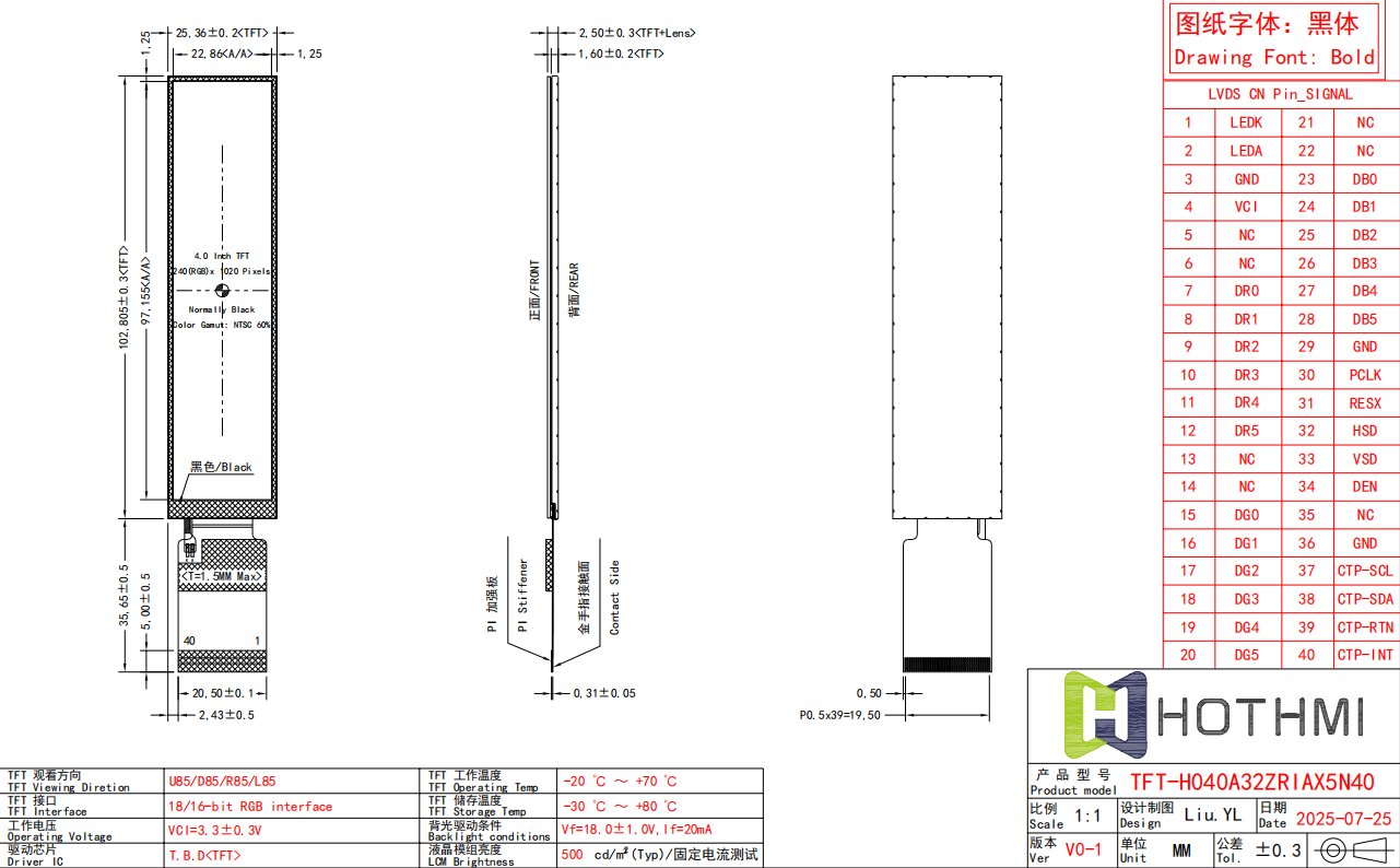 • 型號(hào): 4.0 英寸 TFT LCD | 240x1020內(nèi)嵌式觸摸顯示屏,帶 RGB 接口 TFT-H040A32ZRIAX5N40