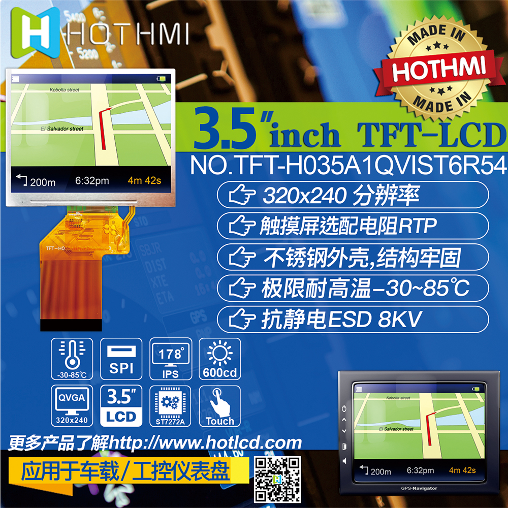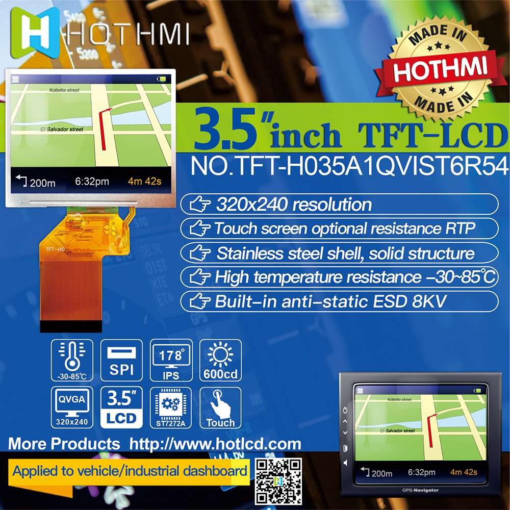 產(chǎn)品描述 TFT-H035A1QVIST6R54 是一款 3.5 英寸寬溫 IPS TFT-LCD 顯示器,帶有投射電阻式觸摸屏,分辨率為 320x240 像素。 模塊內(nèi)置ST7272A驅(qū)動(dòng)IC,支持RGB接口。 TFT-H035A1QVIST6R54采用IPS面板,具有視角更廣的優(yōu)勢(shì),左:80/右:80/上:80/下:80度(典型),對(duì)比度800:1(典型),亮度600尼特(典型) ) 值),眩光面板,4:3 縱橫比。支持I2C接口和單點(diǎn)觸控功能。 H035A1型號(hào)具有投射電阻式觸控面板 (PCAP)。TFT-H035A1QVIST6R54的供電電壓(VCC)為3.0V至3.6V,典型值為3.3V。 它可以在 -30°C 到 +85°C 的溫度和 -30°C 到 +85°C 的存儲(chǔ)溫度下工作。