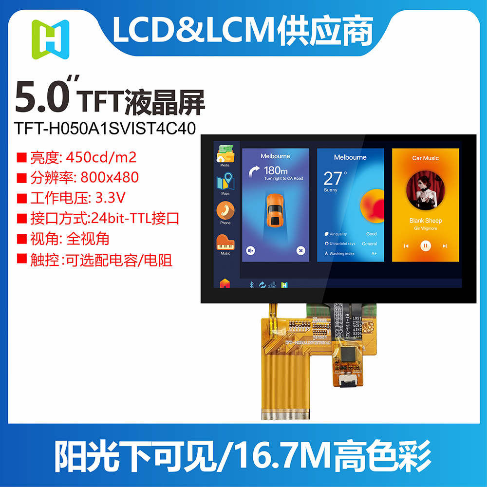 5.0寸TFT/800*480分辨率/全視角/高亮/超寬溫5寸TFT-H050A1SVIST6N40