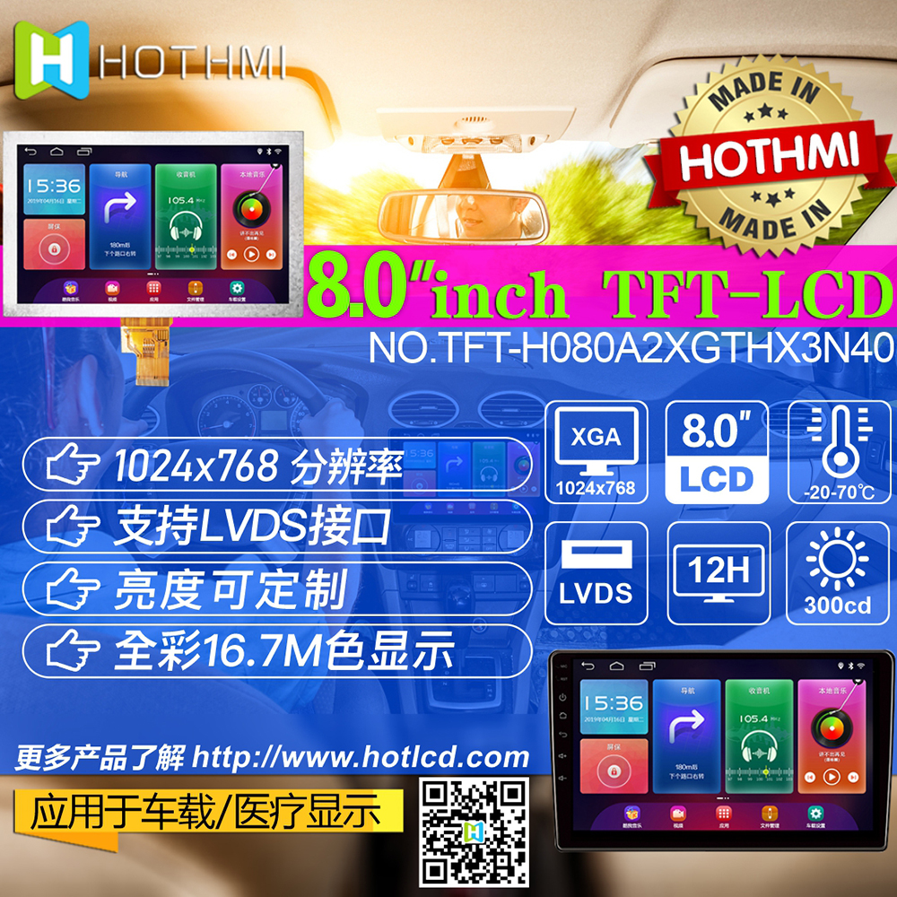 8寸TFT高清/1024*768寬視角/高亮8寸/LVDS-4L接口/TFT-H080A2XGTHX3N40_V0