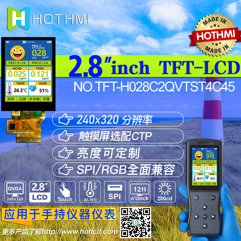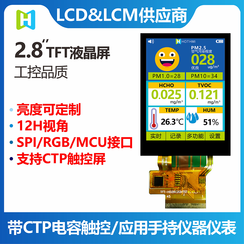 2.8寸TFT彩屏 /240*320分辨率 /12H White LED /RGB/SPI/MCU接口 /TFT-H028C2QVTST2C45/應(yīng)用于手持儀器儀表