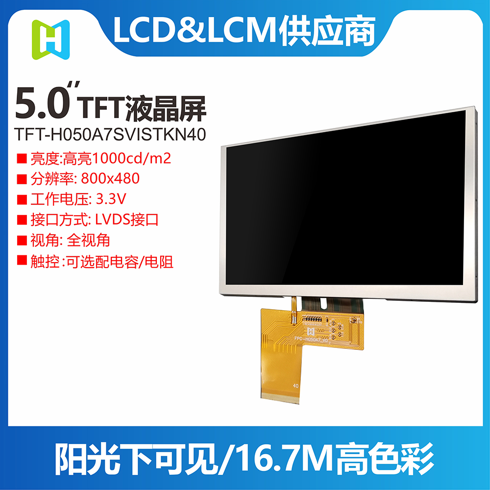 TFT-H050A7SVISTKN40是一款5寸采用IPS面板技術(shù)的TFT液晶顯示器模塊。此款TFT-LCD分辨率800 x 480 pixels。TFT-H050A7SVISTKN40模塊內(nèi)置ST7262 driver IC,支持LVDS接口,對(duì)比度1000 (典型值),模塊亮度為1000 nits(典型值)。H050A7采用IPS面板技術(shù),視角比TN玻璃更廣范圍為左: 80 / 右: 80 / 上: 80 / 下: 80 度,色彩鮮明,具有飽和自然的優(yōu)質(zhì)畫面。H050A7模塊的驅(qū)動(dòng)電壓為3.3V,平常黑/透射式LCD,霧面玻璃,屏幕長寬比16:9。此款模塊的工作溫度是-30℃ 至 +85℃,儲(chǔ)存溫度是 -30℃ 至 +85℃。如果客戶產(chǎn)品應(yīng)用需要使用高亮TFT,可選用TFT-H050A7SVISTKN40模塊,其模塊亮度為1000 nits (典型值)。H050A7系列同時(shí)也有電阻式(RTP)與電容式觸控面板(CTP)供選擇。