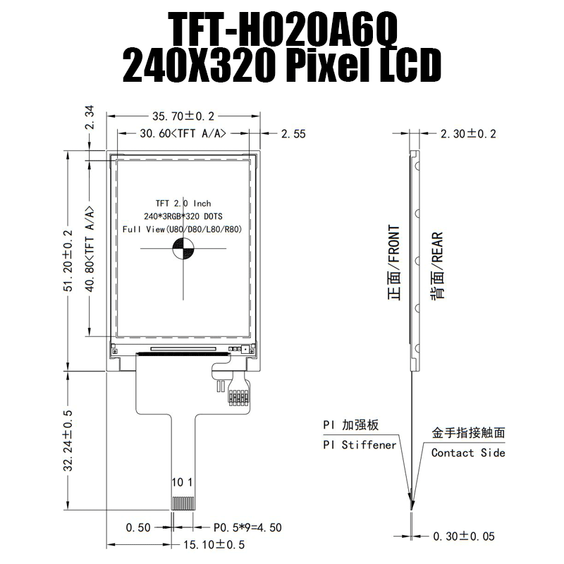 H020A6QVIST6N10是一款2.0英寸微型TFT顯示模組,分辨率為240x320像素。 該微型液晶顯示模塊內(nèi)置ST7789 IC; 支持串行3線/4線SPI接口。 該型號(hào)的模塊尺寸為 35.7 x 51.2 mm,有效區(qū)域尺寸為 30.6 x 40.8 mm; 它的模擬電源電壓范圍為 2.5V 至 3.7V(典型值為 3.3V)。