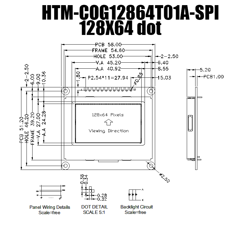 HTM-COG12864T01A-SPI | 單色圖形模塊| 128x64 像素| 透反式LCD | 側(cè)白背光| FSTN (+) 正顯 | 現(xiàn)貨