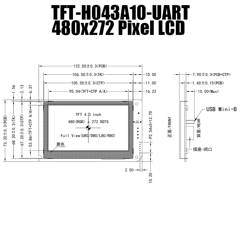 4.3英寸對(duì)角線彩色TFT屏,標(biāo)配無(wú)觸摸/電阻觸摸/電容觸摸